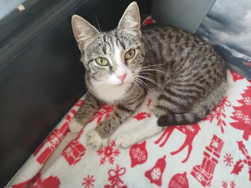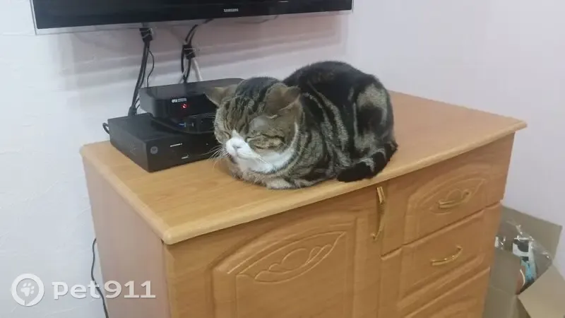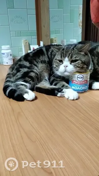 Котик породы шотландский прямоухий, окрас черный мраморный биколор (черные широкие круги по бокам и две чёрные полосы вдоль спины),грудка и лапки белые,хвост полосатый коричневый с черным, с левой стороны на десне черная пигментация, видно при зевоте и оскале, с лева удалены два последних зуба и один с права, убежал во время пожара в МКД на улице Сакко дом 41, котик трусливый, далеко убежать не мог.