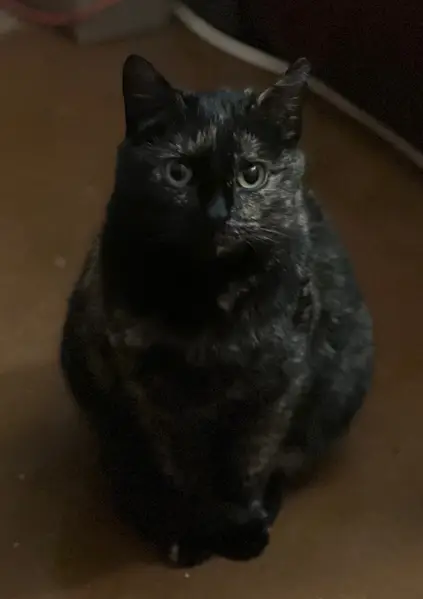 Черепаший окрас, зеленые глаза, на правом ухе не заметный шрам как обычная выпуклость, не мяукает а хрипит (болеет). Выбежала из квартиры ночью примерно в 3:30-4ч. Она уличная, мы ее забрали с огорода, не знаем как выдержит зиму, потому что сильно болеет