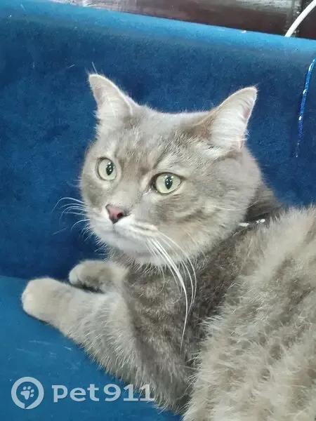 Серо-голубой окрас, с серым ошейником, отзывается на кличку Пипик. Упитанный, ласковый. Ушёл гулять вечером в течении получаса пропал, далеко от дома не уходит.