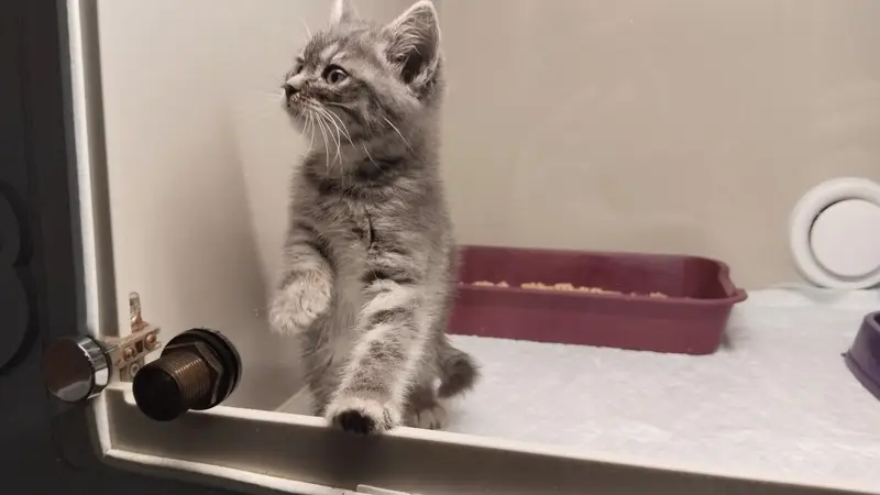 Над правым глазом у кошечки на голове есть светло-рыжая полоска, полосатые лапы, коричневого цвета глаза, она трёх цветная, на хвосте рыжие полоски, она выпала с балкона второго этажа, родители заметили не сразу.