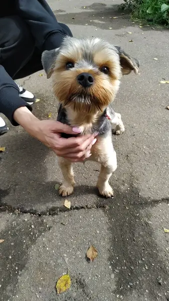 Коричневый йорк, маленький, на ушках кисточки, был в шлейке, открыли дверь в квартире и убежал по этажам, внизу кто-то открыл дверь на улицу и он убежал.