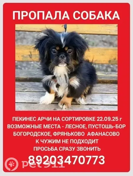 Пропал пекинес Арчи, на Сортировке, 22 сентября. Позже был замечен в м. Лесное, убежал в лес. Потом видели, побежал в сторону Пустошь Бора. Возможные места - Лесное, Богородское, Сортировка, парк 1905 г, Фряньково, Пустошь Бор, Афанасово. К чужим не подходит. Просьба сразу звонить 89203470773, Елена