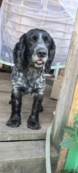 Окрас черный,на груди белая манишка,на голове чубчик,пострижен машинкой,на левой задней лапе между пальцами белая шерсть.Приветливый,контактный 11 мес.