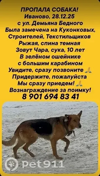 Здравствуйте,пропала собака помесь овчарки и охотника.Возраст 10 лет.Окрас как у овчарки,телосложение как у охотничей собаки.Девочка ,зовут Чара,на ней ошейник зеленого цвета тканевый.28.12 сбежала со двора частного дома.В районе ул Демьяна Бедного.Просьба ,у кого есть любая информация напишите,позвоните по этому номеру 89016948341 Аксана.Спасибо.