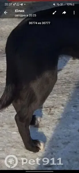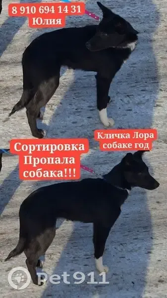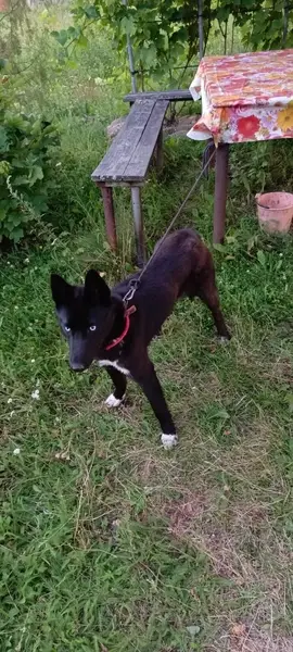 Молодая собачка,средних размеров,ушки стоят,окрас чёрный,правая передняя лапка белый гольфик и на остальных лапках-белые пятнышки на пальчиках!Выбежала в ворота,побежала за стаей собак в игре...