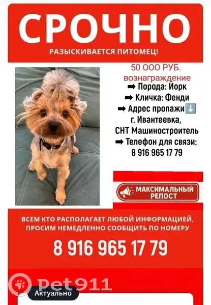 Пропала собака Йоркширский терьер!!! Вознаграждение 50000 21.08.2025 потерялась , выбежала из ворот дома. .Место: Ивантеевка, СНТ Машиностроитель - Кличка Фенди , 3 года - Девочка, Йорк . - ошейник, хоричневый со стразами -Дружелюбная, пугливая. - Если будет возможность отправьте нам фото и местоположение. - Если вы приютили нашу собачку, настоятельно просим вернуть, для нас она член семьи. - Если такая собака появилась у ваших соседей или увидите её на выгуле, пожалуйста, скажите им, что её ищут, попросите позвонить нам и обязательно позвоните сами. Просьба сообщить по телефону +7(916)9651779 Елена +7 (999) 815-46-03 Анастасия