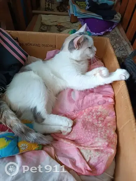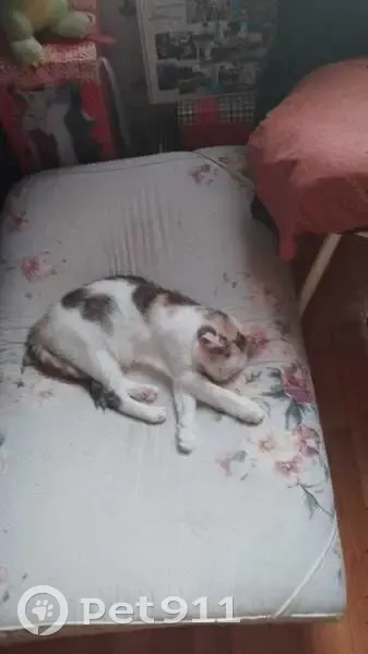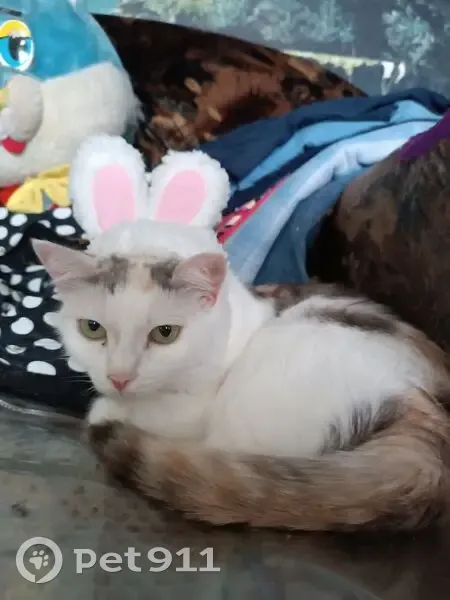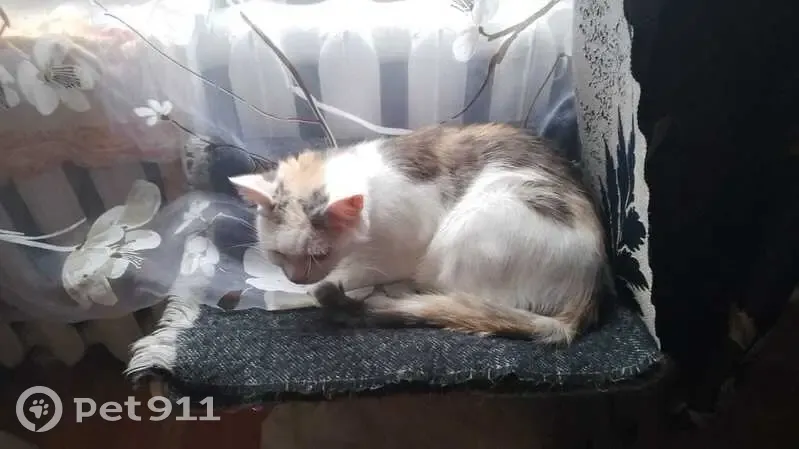 Трёхцветная домашняя кошка, в основном белая. Глаза светло зелёные. Взгляд серьезный. Тихая, спокойная, в стрессовой ситуации скорее всего будет бояться и прятаться Упала с балкона днем, возможно ранена лапа