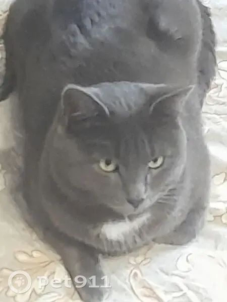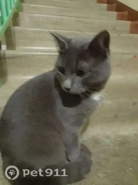 Цвет темно-пепельный, белое пятнышко на груди. Возраст примерно 3 года. Сидел под дождём, весь потерянный. Игривый, ласковый, ухоженный. Осмотр у ветеринара пройден, кастрирован.