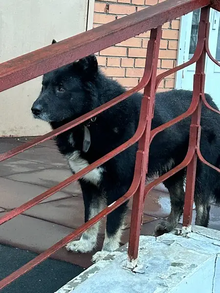 Собака с зеленым ошейником, часть карабина сломана. Черный окрас, белый воротничок, одна лапка белая с черными пятнышками, другая коричневая. Собака напугана