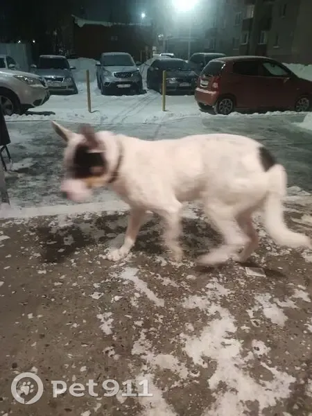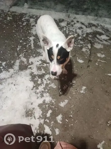 Собака среднего размера, белого цвета, на хвосте чёргое пятно, не очень доверчивый, но не еду принимает, в подъезд не идёт, но и контакт не исключает, хотела завести его а подъезд, не пошёл