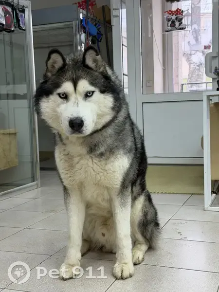 Голубоглазый хаски в ухоженном коричневом ошейнике, очень контактный и дружелюбный, в клетку зашел как к себе домой, придержать можем только до вечера