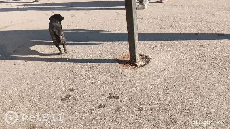 Черная собака, на животе белая шерсть. Бегала по остановке и ее окрестностях рядом с людьми, на ошейнике серебряная косточка. Под хвостом какая-то воспалившаяся и раздувшаяся рана. Кабель.