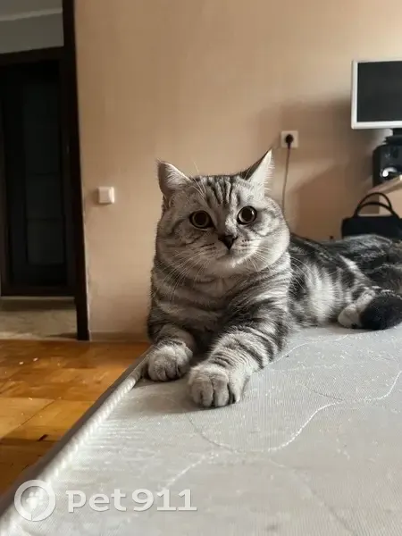 Кот породы британец, окрас мраморно- серый. Убежал в сторону оврага через дорогу от дома по адресу Оружейника Драгунова 64. Он очень пугливый, первый раз на улице.