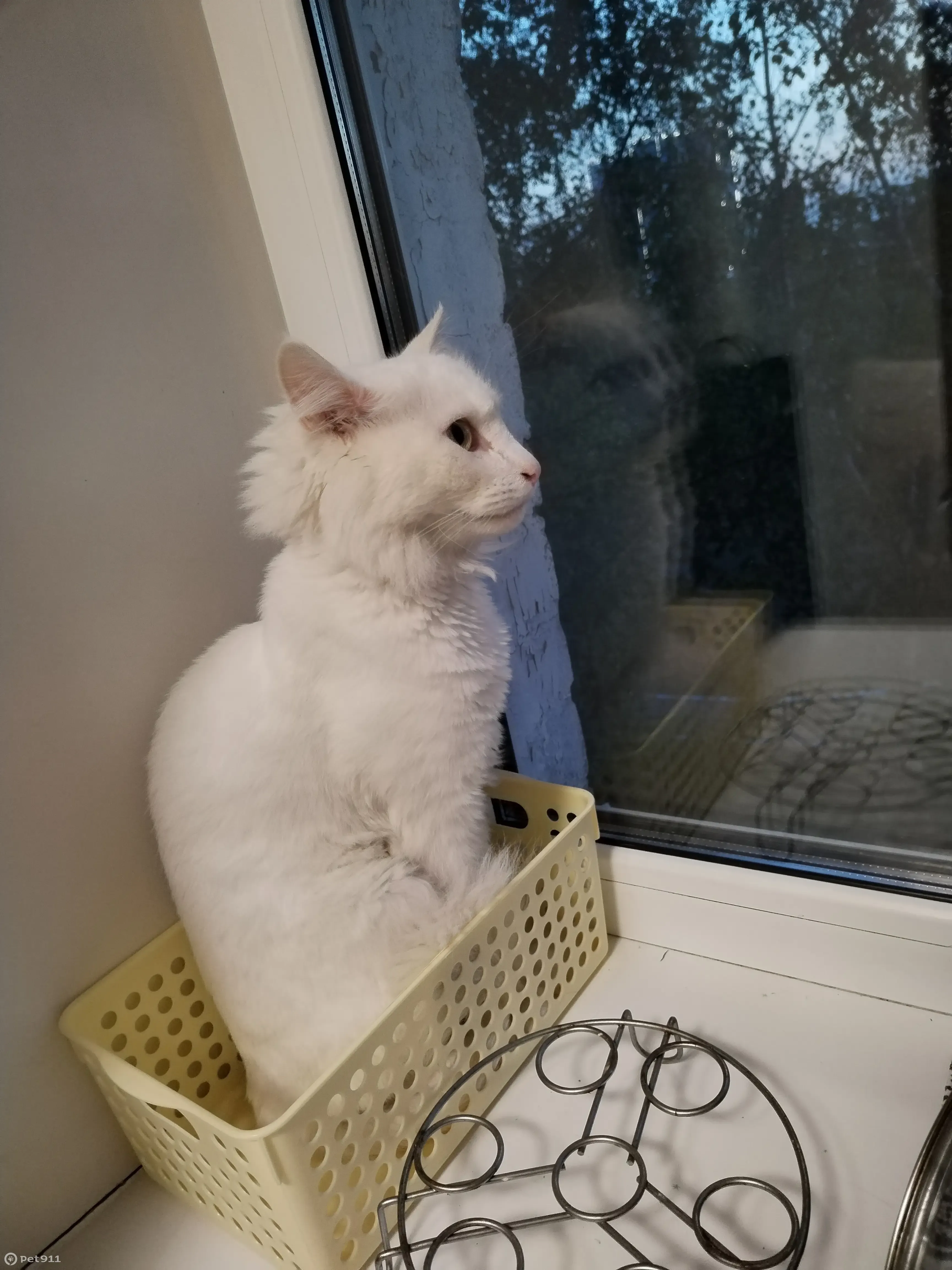 Здравствуйте. Сегодня утром потерялся белый стриженый кот. Один глаз голубой, другой жёлтый. Кот глухой, поэтому на звуки не реагирует. Может громко мяукать когда напуган