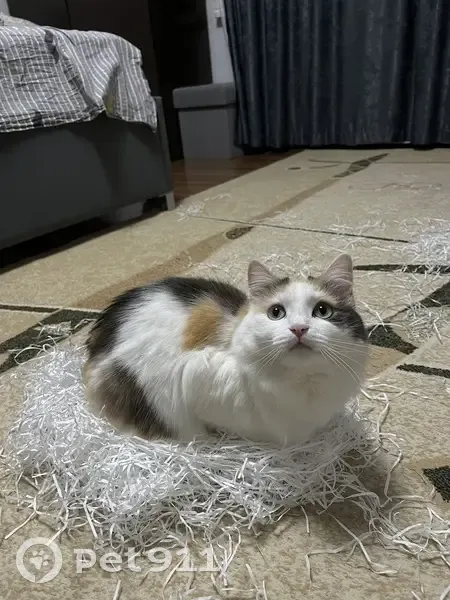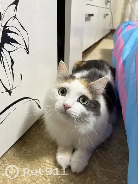 Сбежала в ночь с 6 на 7 ноября через окно. Пугливая, к чужим в руки не пойдёт. Скорее всего сидит в укромных местах. Возможно на огороженной частной территории прямо рядом с домом. Мы договорились с работниками Ж/Д вокзала, они разрешили перелазить забор и вести поиски. Девочка, трёхцветная.