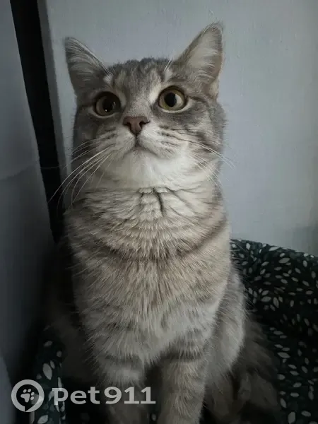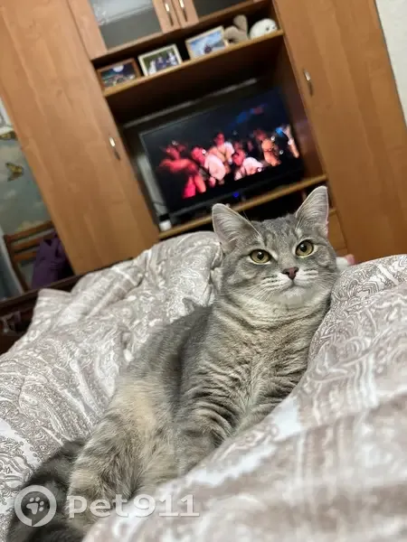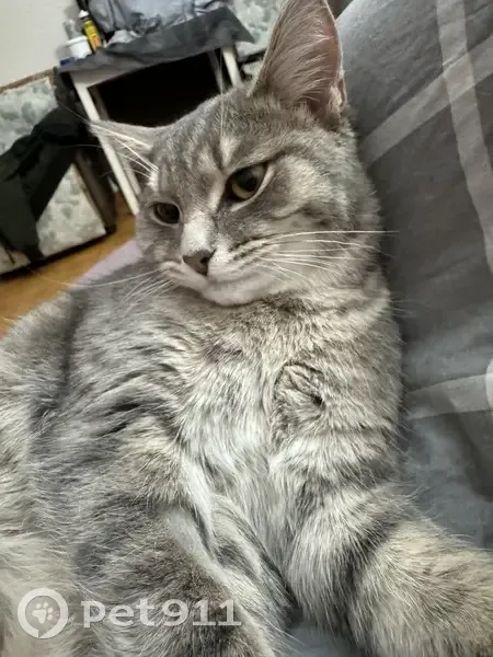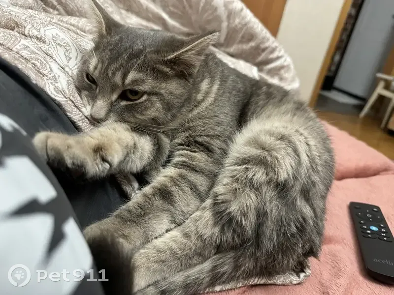 Мальчик, на вид 8 месяцев, серый в полоску, лапы длинные, кастрирован, слегка вытянутая мордочка, чипирован. Выбежал из квартиры, не смогла поймать из-за травмы колена.