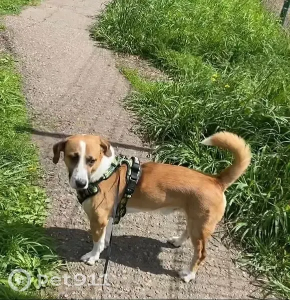 Вечером, 13.08.2025, сорвался с поводка в районе Холмогорова, 14, побежал в сторону Майской, был в шлейке, как на фото, с веревкой от поводка. У собаки приступы эпилепсии