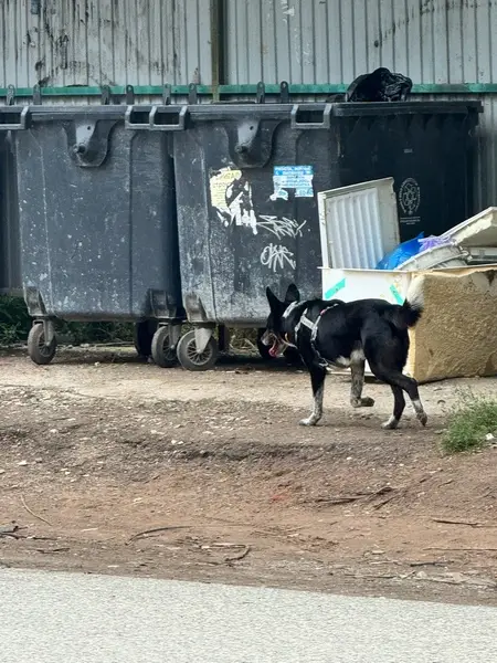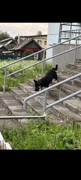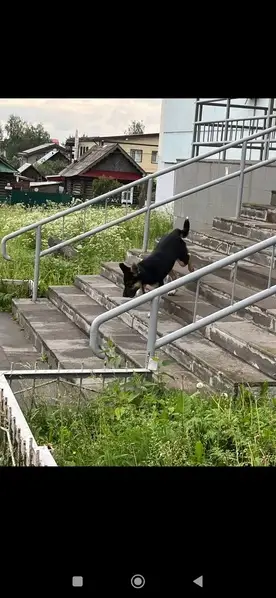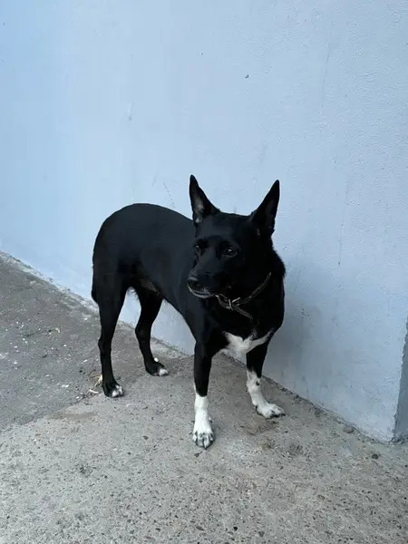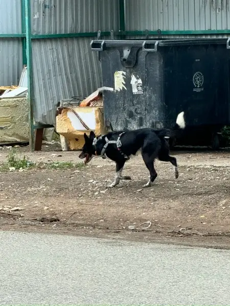 Черная с белой грудкой,рост по колено Откликается на Кличку Альма.