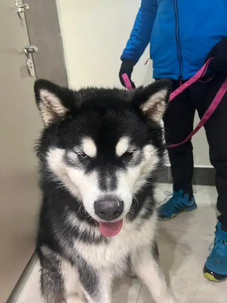 Окрас чёрно - белый, глаза разного цвета, мальчик добрый и игривый, чёрный ошейник.