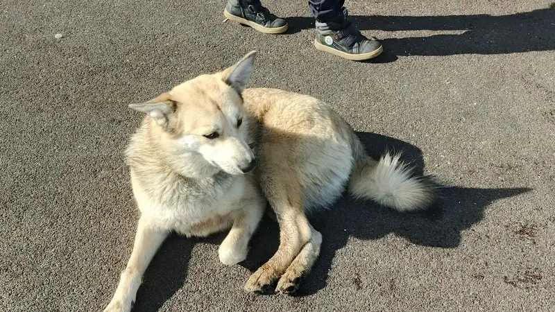 Собака среднего размера, в холке ниже колена, окрас лайки, ориентирована на человека, возможно беременная