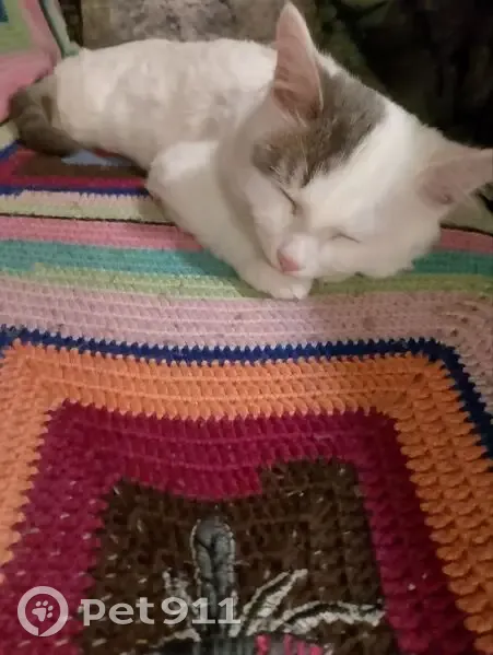 Молодой ,белый котик с пятнами на ухе задней лапе,хвост тоже темный. С красивыми желтыми глазами с зелёной окружностью. Убежал при открытие входной двери.