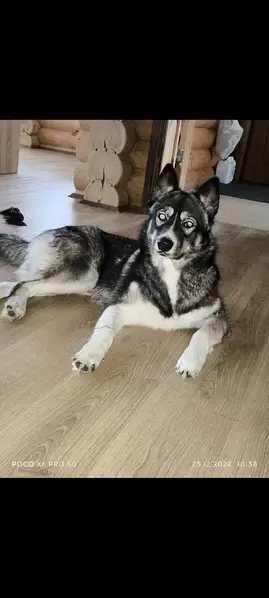 Сибирский хаски, кобель, черно-белый. Ошейник предположительно сделан из ремня. Собаку видели на платформе в г. Дрезна и в д. Кабаново. Возможно добралась на электричке.