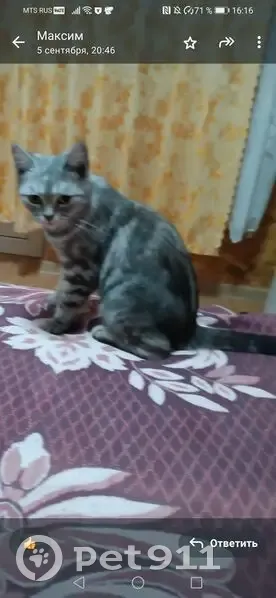 Окрас серый в полоску, не крупная. Кошка 3 лет с жёлтым ошейником. Зовут Соня. Пропала рано утром 11 сентября в районе ул. Революционная, 63/2. Выбежала с номера отеля.
