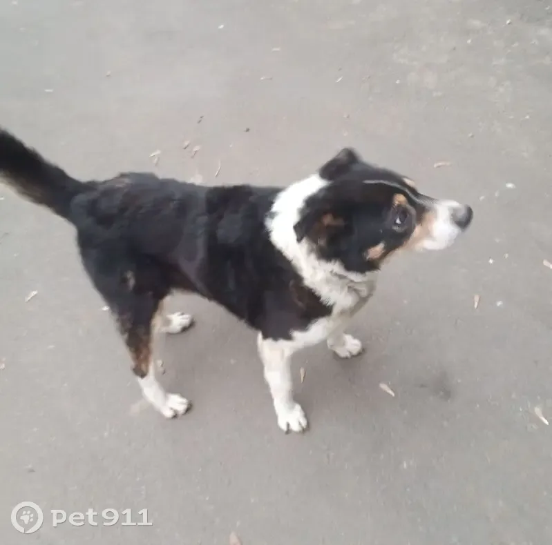 Мальчик среднего роста, черно-белого окраса, на мордочка над глазами коричневые пятнашки, и черно-коричневве щёки. Спереди между передними лапами большая опухоль прихрамывая на правую заднюю лапку. Хвост пушистый. Лапки белые.