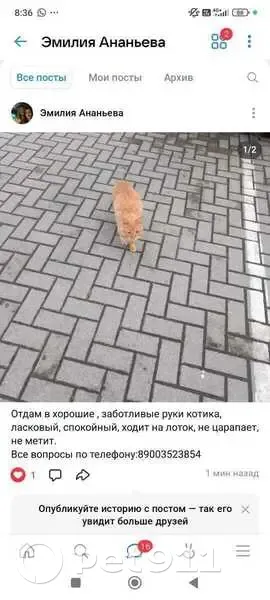 Найден рыжий кот, бывший домашний(потерялся или выкинули),ходит строго в лоток, ласковый, воспитаный не где не лазает, когти не точит не метит, ищет старых или новых хозяев, у себя оставить не могу. Хозяин найдись быстрее!