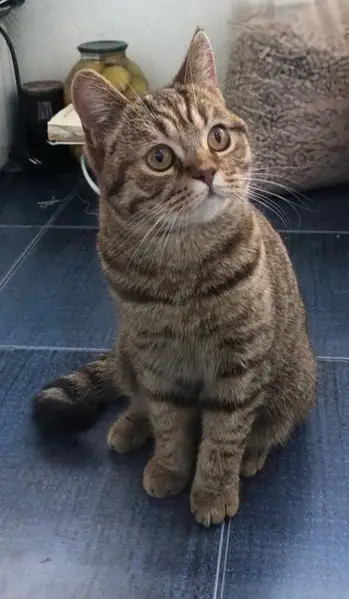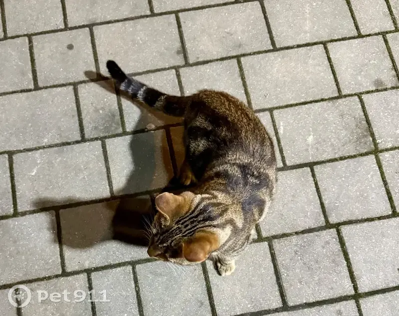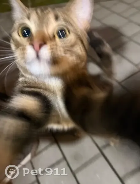 Найдена кошка окраса табби с золотистыми глазами, молодая, домашняя - красивая гладкая шерсть, подстриженные когти, контактная, идет к людям и собакам, мяукала и металась по улице, пришла на первый зов, с удовольствием погладилась и уже не отходила