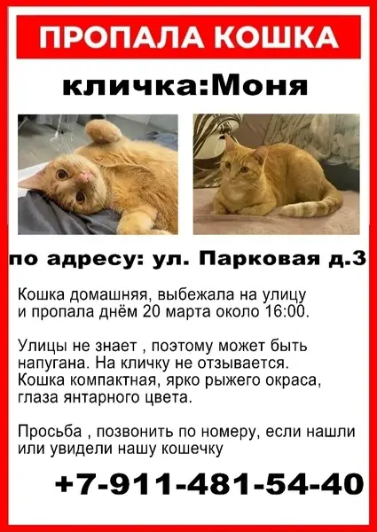 Ул. Спортивная, дом 62, с утра 19-го апреля бегает молодой рыжий кот в ошейнике. Очень ласковый. Может кто-то потерял.
