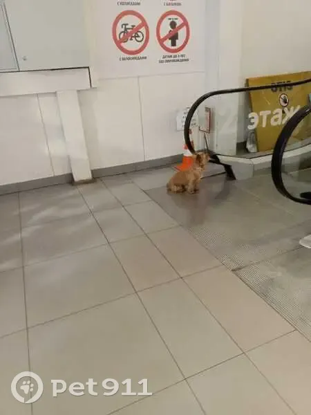 Найдена собака породы йоркшерский терьер, бежевого окраса, в белом ошейнике. ТЦ Виктория Согласия 1 Стоит на 1 этаже возле эскалатора. Смотрит на верх. За информацией звонить по номеру +7(911)4719756