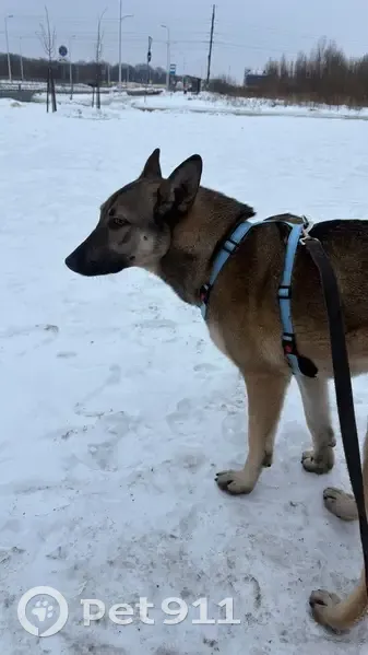 Собака с синей шлейкой , добрая , пугливая, металась искала хозяина.