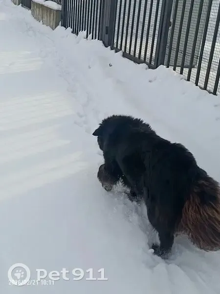 Нашлась собака в районе Ростех арены около первого входа КПП, вроде пёс, но я не уверена. Чёрный и очень пушистый слегка лохматый. Вполне дружелюбный, прыгать, не прыгает, не лает, но и ластица тоже не лезет. Глаза янтарного цвета. Собака довольно крупная, на вид возможно около 60 килограмм. Бегает с ошейником, поэтому и подумала, что он, наверное, чей-то. Как сказали охранники на проходной бегают не первый день, его можно встретить от входа с набережной ветеранов около вип, и, по словам охранников, он почти всех проводит до самого входа.