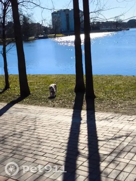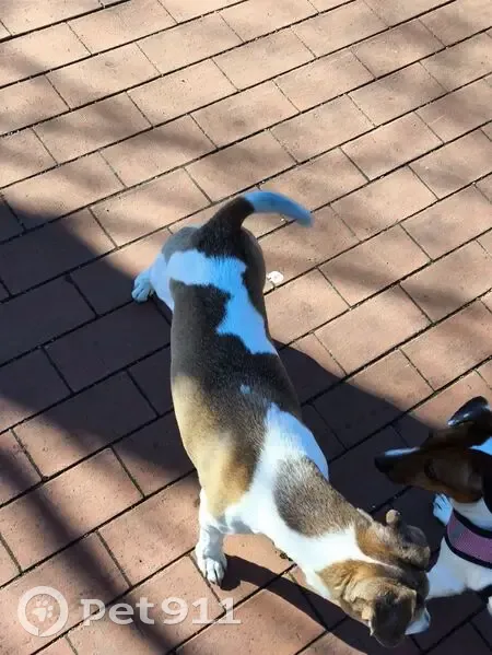 Бело- коричневый, не похоже на бездомную, ошейника нету, вроде смесь Джек Рассела с кем то , ходит в одной области возле детской площадки