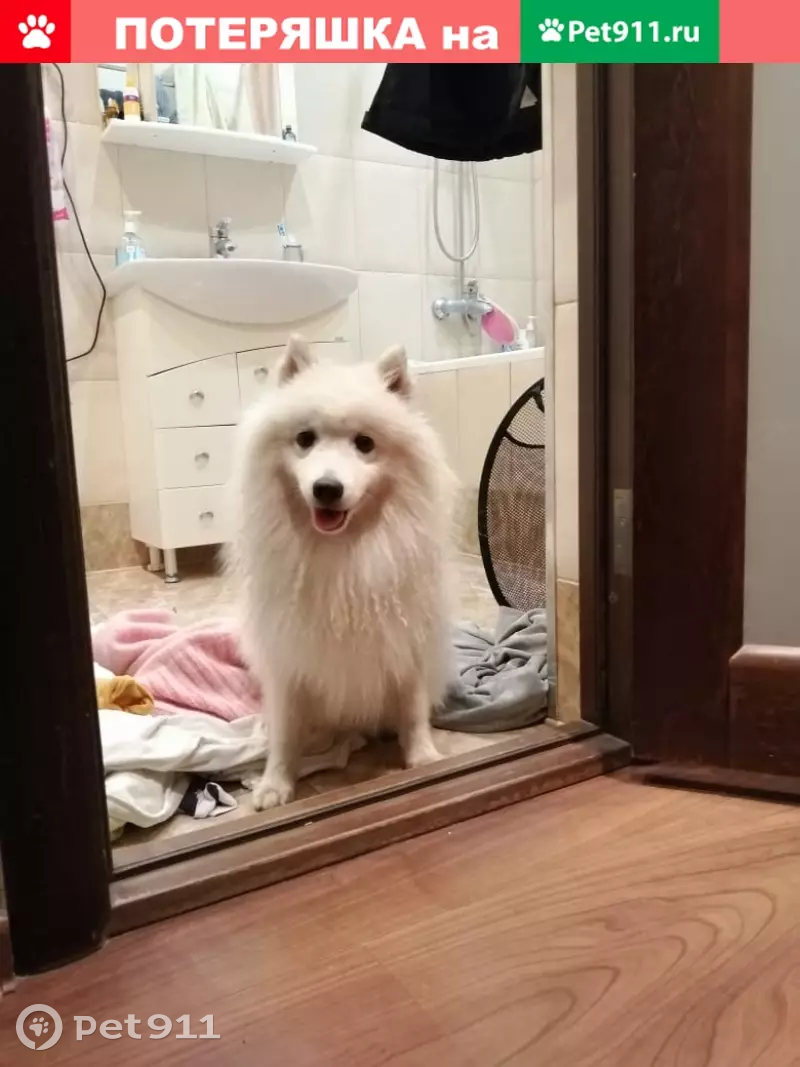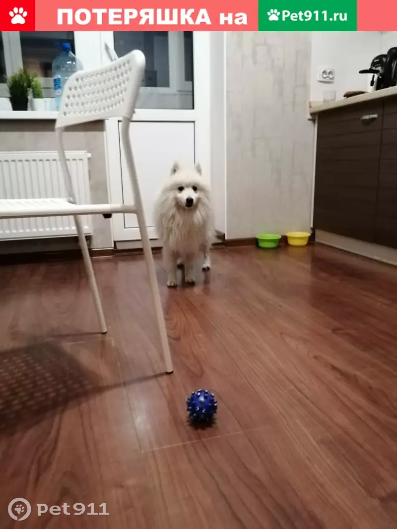 Кобель, белого окраса, пушистый. Обнаружили на остановке на ул. Невского 1 ноября. Вернулись 2 ноября, он там же. Забрали домой. Ищет хозяев или желающих забрать.