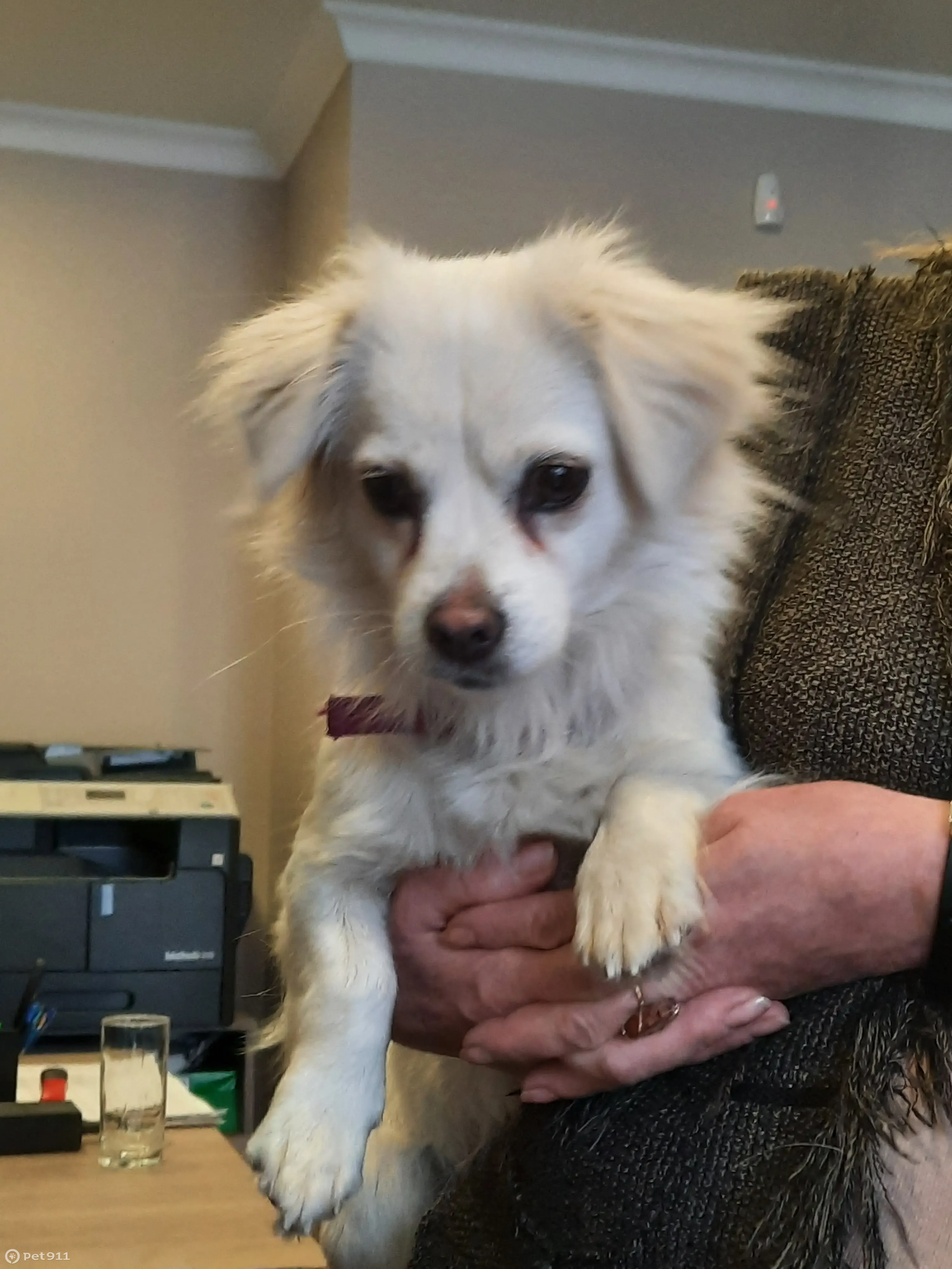 Белая девочка, найдена на остановке. Очень замерзла. Просидела около 3 дней на остановке. Забрали пока к себе, ищем хозяев. Осталвять собаку негде.