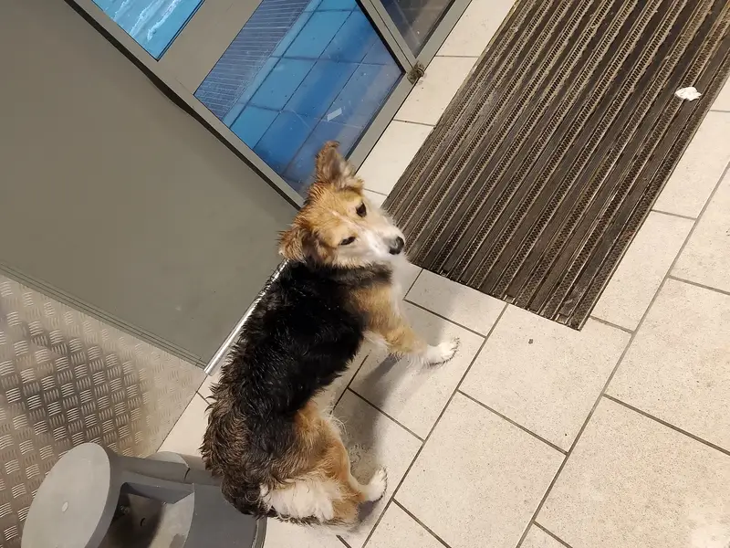 Щенок прибился за девочкой,она спросила,не знаем ли мы его хозяев,уже около недели,судя по объявлениям из информациооных групп он бродит по округе и очень мерзнет.Шерсть не пушная,из-за дождя быстро намокает,собака мерзнет и очень напугана.Мы пустили его погреться в магазин и он сразу же уснул.От еды первые часа 4 отказывался,просто спал и восстанавливал силы(Бегал от человека к человеку,заглядывал в лица и буд-то искал кого-то.У него красный ошейник на защелке,на бездомного не похож,хоть и поплохел за время путешествий.Очень ласковый,осторожный.Не могу ответить что за порода,окрас ближе к рыжему,с белыми лапками и пятном на холке
