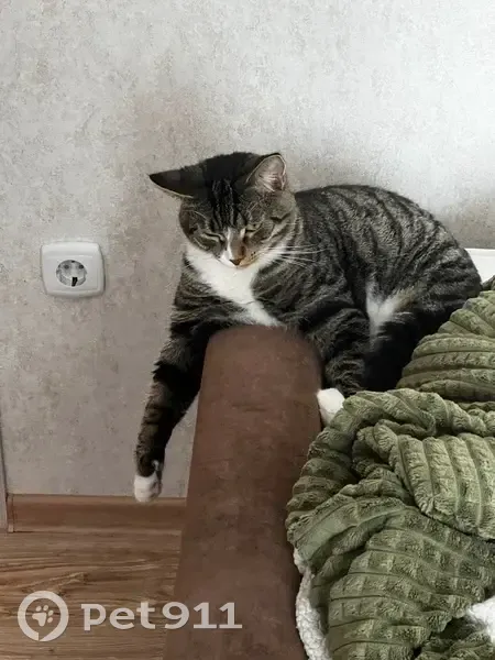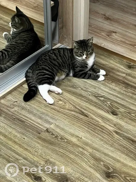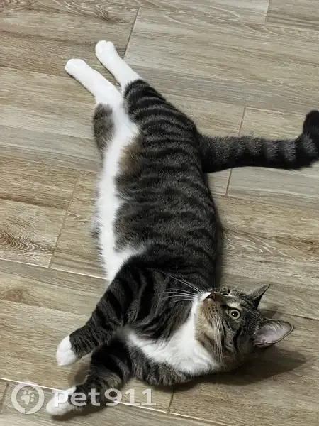 домашний кот, на улице никогда не был, очень пуглив к чужим. Окрас - полосатый, задние и передние лапки беленькие «в носочках». Носик разделен по окрасу на две части.
