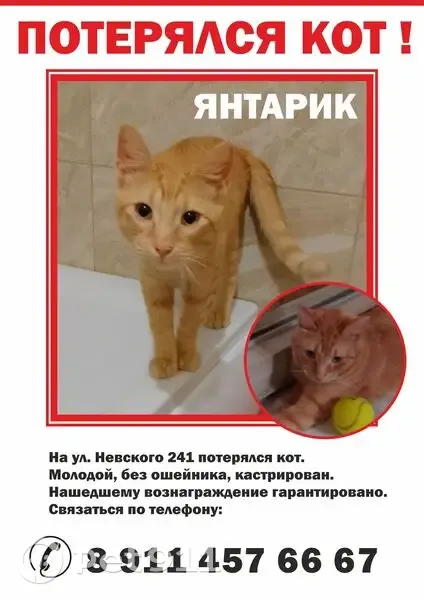 16.10.25 потерялся рыжий кот Янтарик по ул.А.Невского,241. 1,5 года, кастрирован. Полностью рыжий со светлыми полосками на хвосте.Буду признательна за любую информацию. Нашедшему вознаграждение 5000 руб. +79114576667