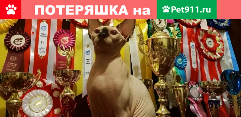 Канадский Сфинкс,Имя Тойота,полтора года. Очень ласковая и нежная девочка.Разорвала сетку на окне и прыгнула за голубем( под окном кормят всегда голубей). Это случилось 13.08.2019.Обнаружили что её нет дома в 18.00, искали не нашли.Выпрыгнула примерно в 14.00