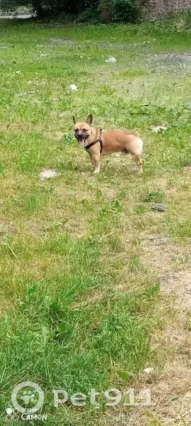 Рыжий, метис французского бульдога, хвост купирован, морда не плоская, уши большие, стоячие, сзади очень похож на французского бульдога. На шее коричневый кожаный ошейник.