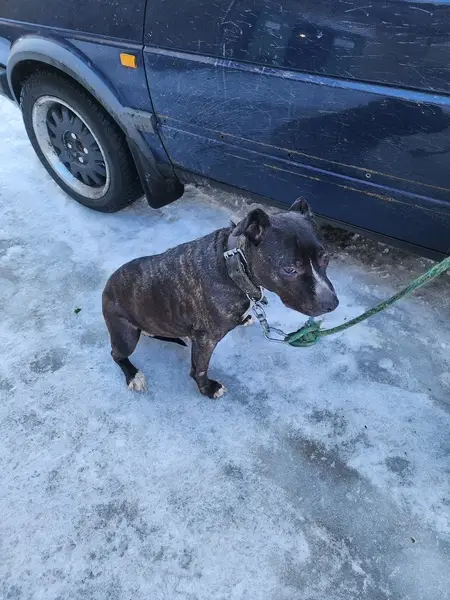 Рост по колено, средних размеров, темного цвета с белой грудью, коричневый ошейник, абсолютно безобидная и добродушная.