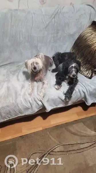 Окрас: черный, с белой челкой, шерсть кучерявая, кончики лап белые, похож на пуделя, но китайская хохлатая собака