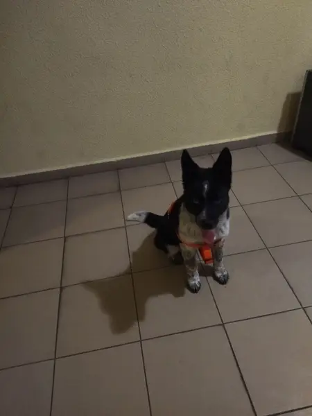 Испугавшись грома, вырвалась из ошейника. Порода австралийский хилер, окрас седой, с черными пятнами на морде. Кличка ЮТА.