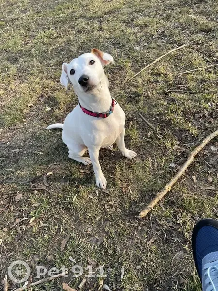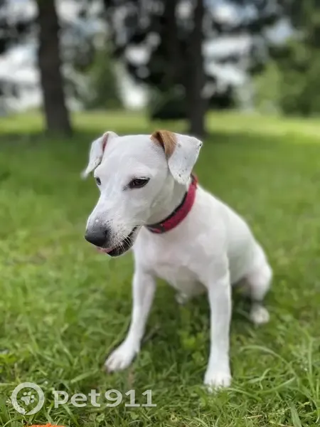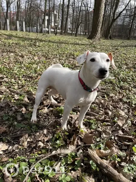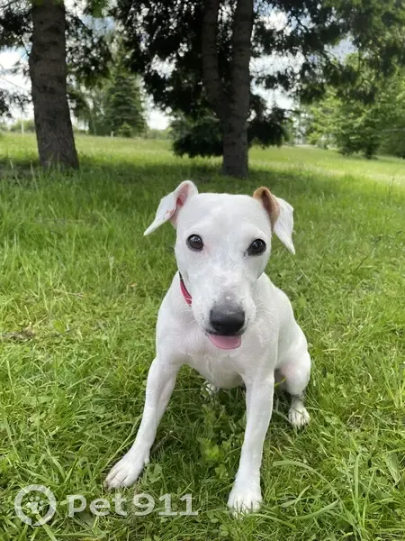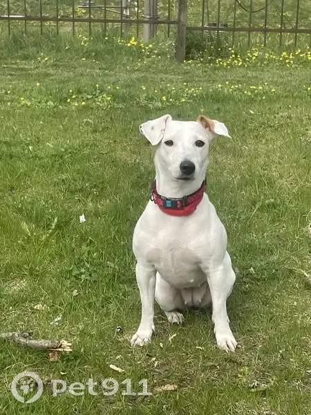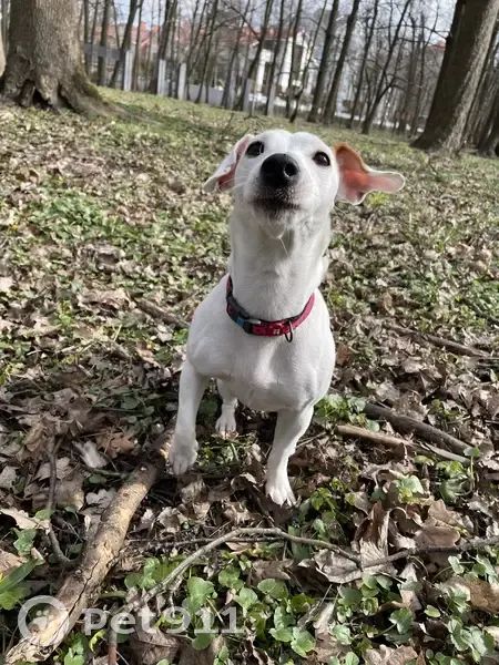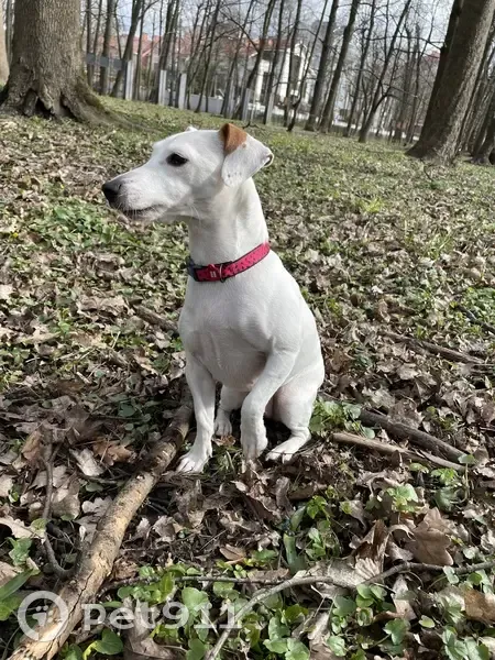 Джек Рассел, девочка, беленькая, на ушке рыжее пятнышко. Два ошейника_ красный против блох., малиновый в мелкий горошек обычный. Течка второй день 🤦♀️
