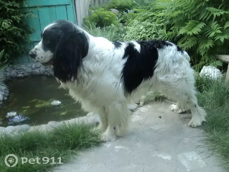Спаниель, белый с чёрными пятнами, отзывается на кличку Бося.