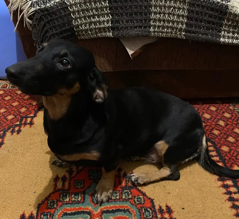 Такса 9 лет. Окрас черный атлас.на лбу белое пятнышко.морда немного седая ,на груди есть лысое место,и на задней лапке один коготь в бок смотрит.