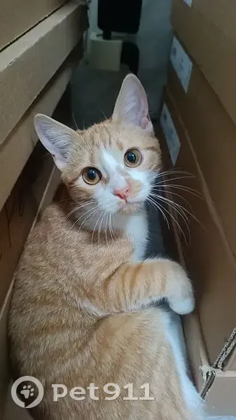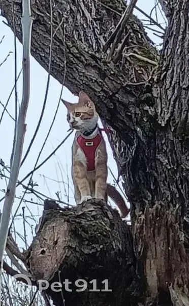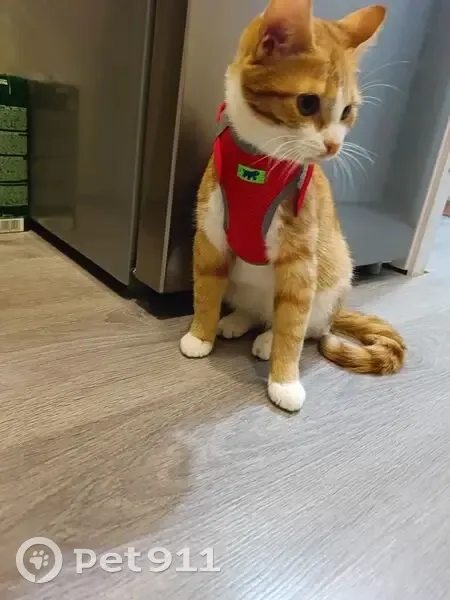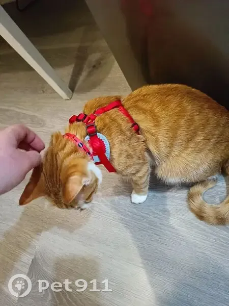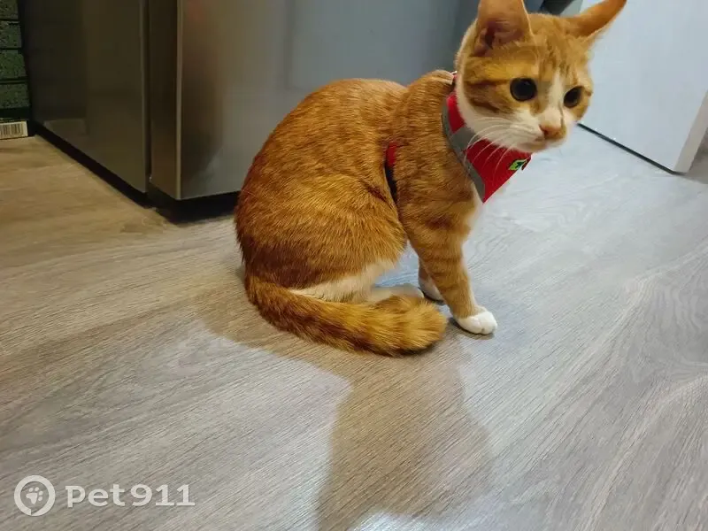 Рыжая кошка с белым животном и лапами, в чёрном ошейнике и Красной шлейке (как на фото) Поехали гулять, испугалась звука проезжаюдего автомобиля и куда-то убежала. 4 часа поисков результатов не дали. Откликается на своё имя Боязливая, к незнакомым людям подходит неохотно.