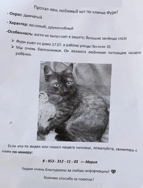 11 сентября в районе Правобережья найдена кошка породы экзот. Была с черным ошейником. Кошка была истощена и практически не могла двигаться. Лечение в ветлечебнице и на дому проводили 2 недели. Сейчас кошка интенсивно набирает вес. К лотку приучена. Покладистая, любит ласку. Ест, и сухой корм, и корм консервированный, и сырую говядину. Отдадим в добрые руки. Держать больше нет возможности, так как в доме есть кот, который сильно переживает (ревнует). Тел. : ... Надежда.
